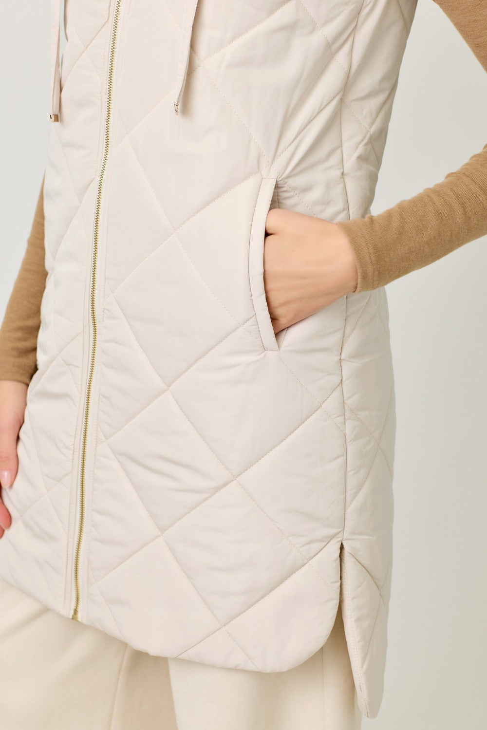 Stay warm and stylish with the Billie Puffer Vest, designed to provide cozy comfort and practical details. Its thigh-length cut with a hi-lo hem and side slits offers easy movement and a flattering fit. The front zipper closure and adjustable drawstring hoodie add versatility and protection from the elements. Convenient side pockets keep essentials close, making this vest a perfect layering piece for chilly days.