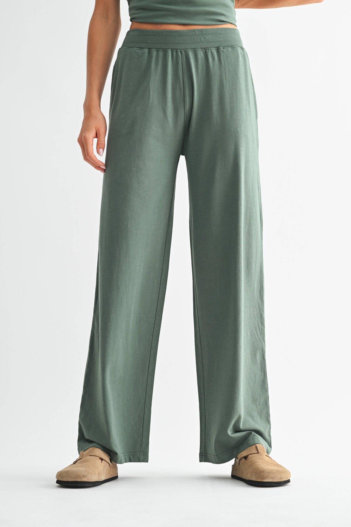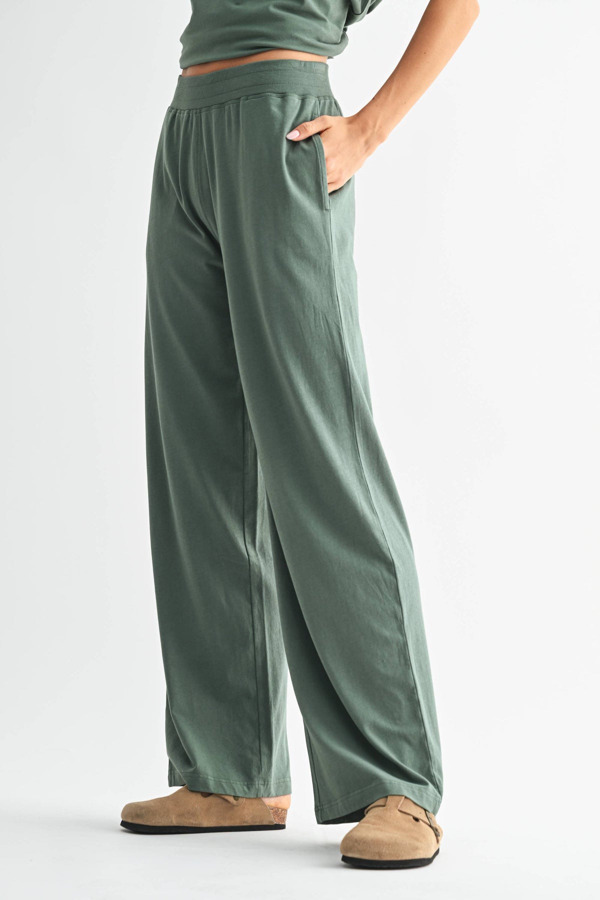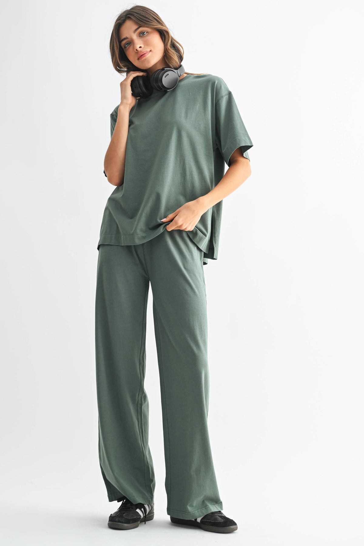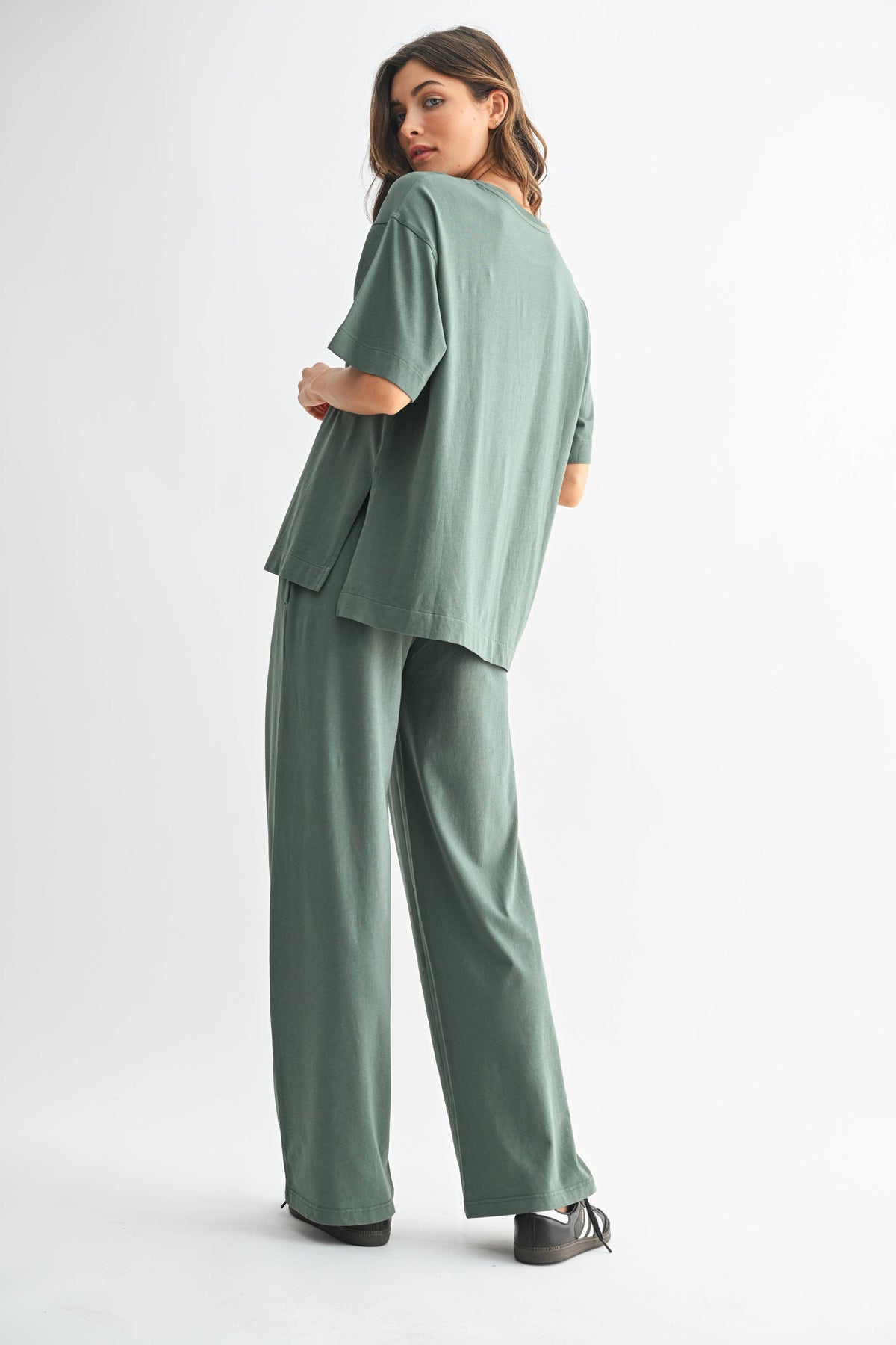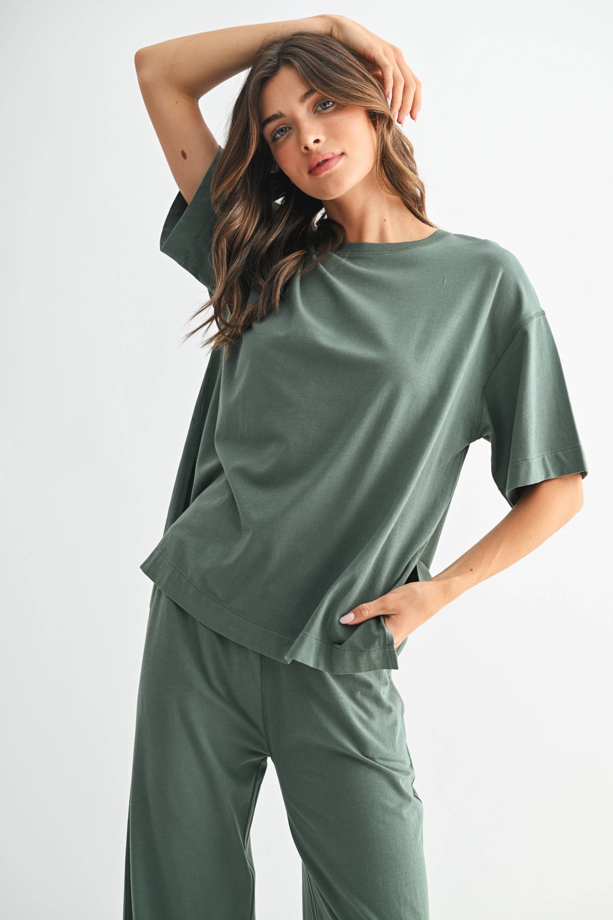 This laid-back set features an oversized short sleeve tee and wide leg pants, both crafted from ultra-soft Pima cotton and treated with a mineral wash for a uniquely lived-in look and feel. Designed for relaxed comfort, the top features dropped shoulders and side slits, while the wide leg pants complete the effortlessly cool silhouette—perfect for lounging or laid-back days out.