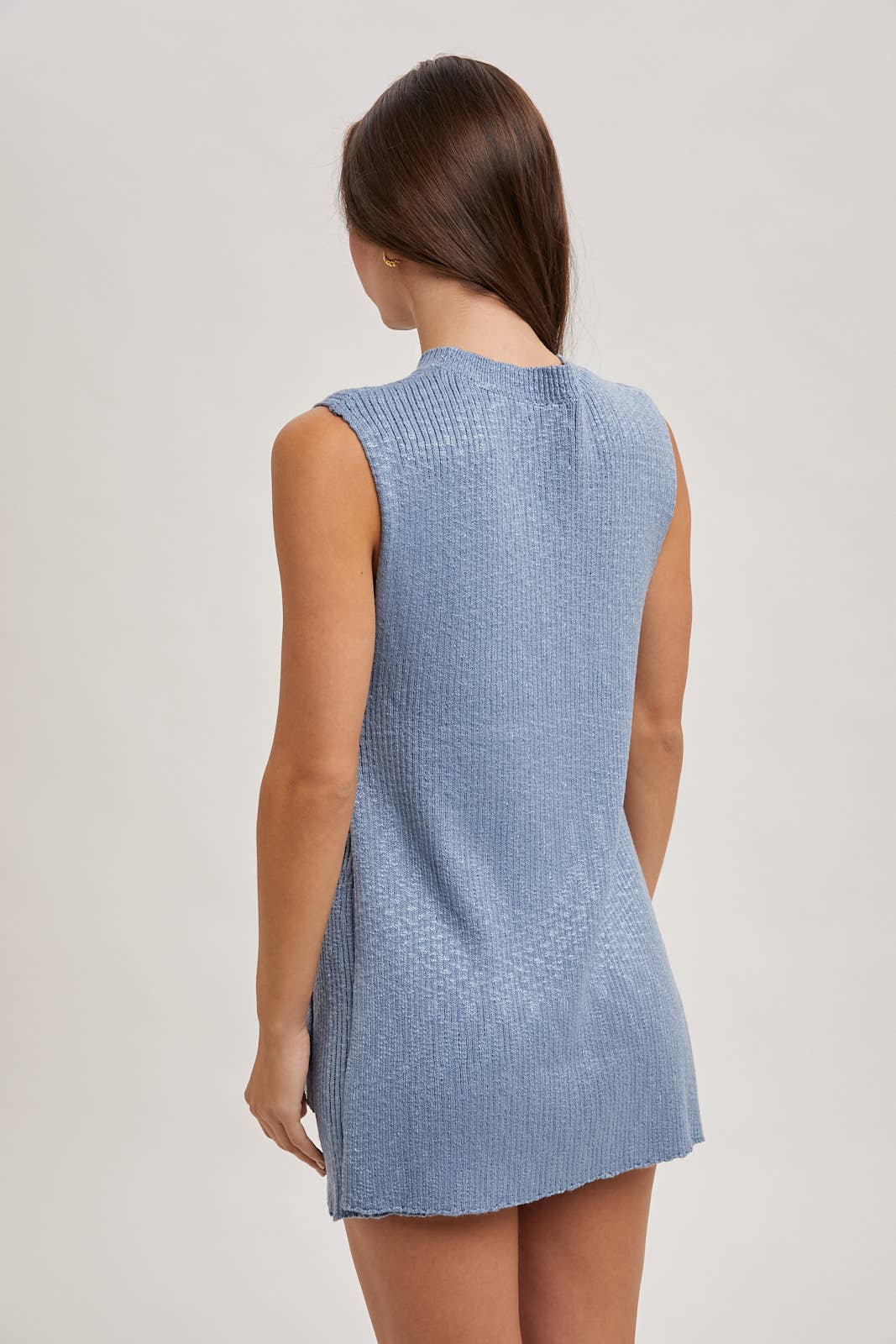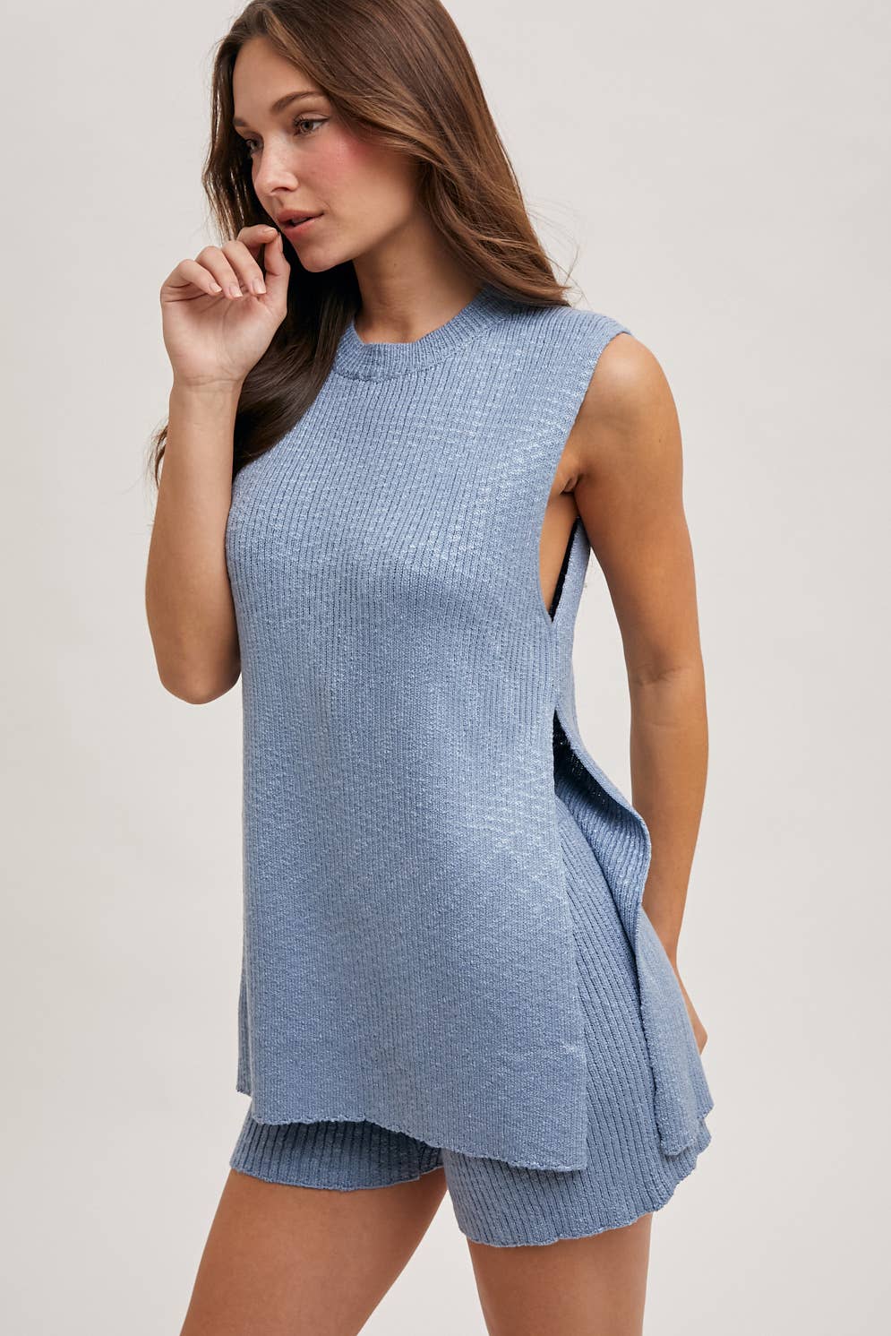 The sleeveless side slit and short knit sweater set is a chic and comfortable ensemble perfect for various occasions. This set includes a sleeveless knit top with stylish side slits and matching knit shorts. The side slits add a touch of flair and ease of movement, while the shorts provide a relaxed yet fashionable look. Ideal for both lounging at home and casual outings, this set can be dressed up with accessories or kept simple for a laid-back vibe. Perfect for transitioning between seasons, it combines style and comfort effortlessly.