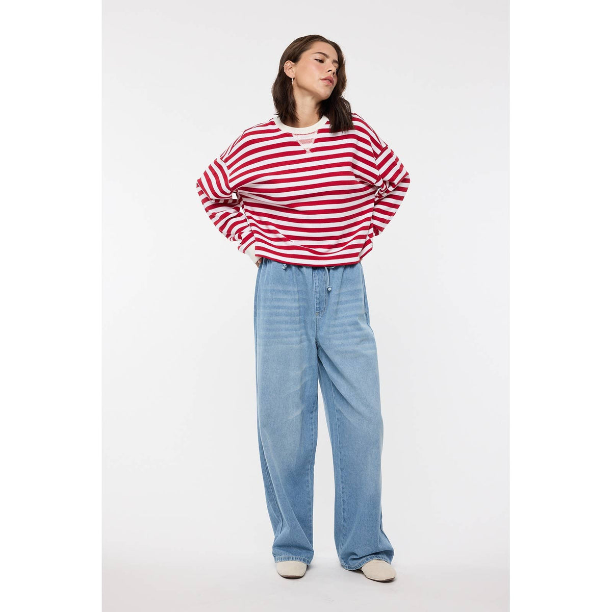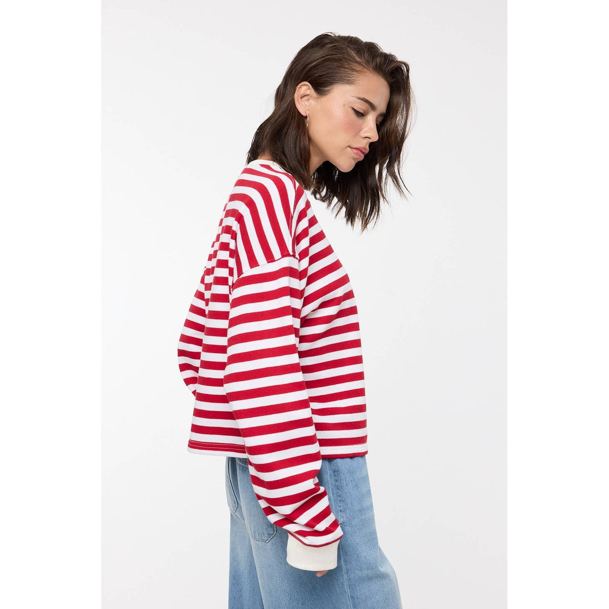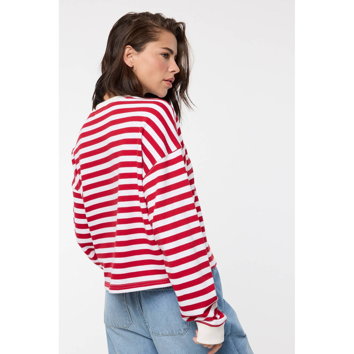 This relaxed crop knit top features bold contrast stripes and offers a loose, comfortable fit that's perfect for all-day wear. Its easy pullover design makes it a stylish and effortless addition to your wardrobe.