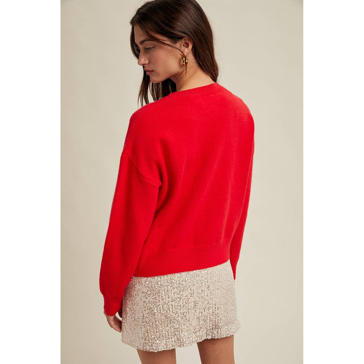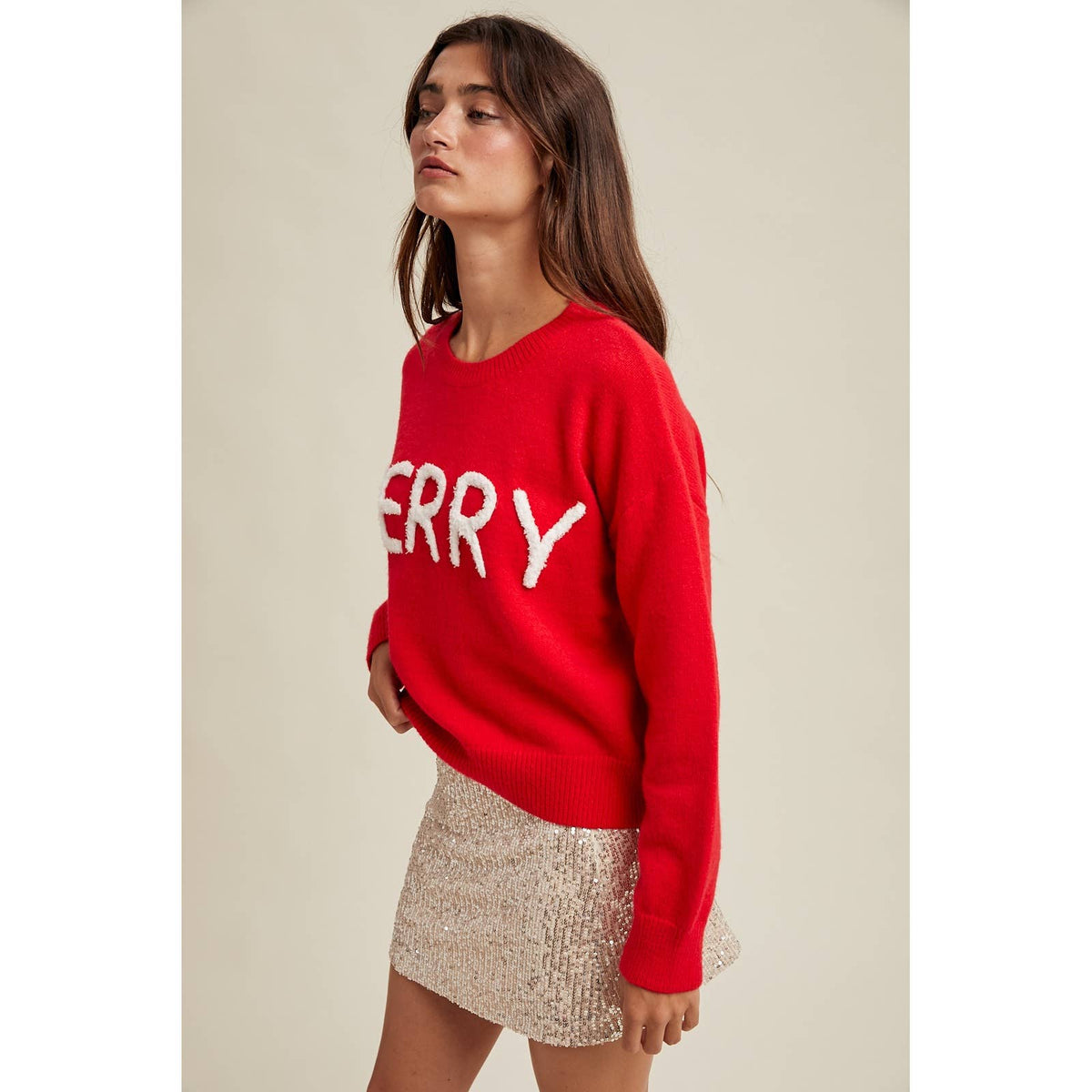This fluffy sweater will quickly become your go-to pullover this December. Its cozy design makes it perfect for pairing with everything from skirts to denim jeans for an effortless chic festive look.