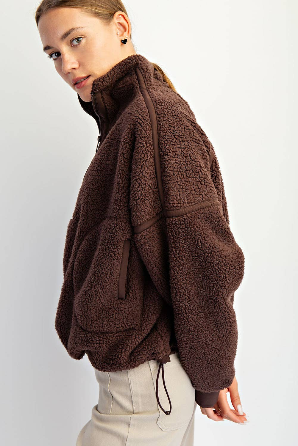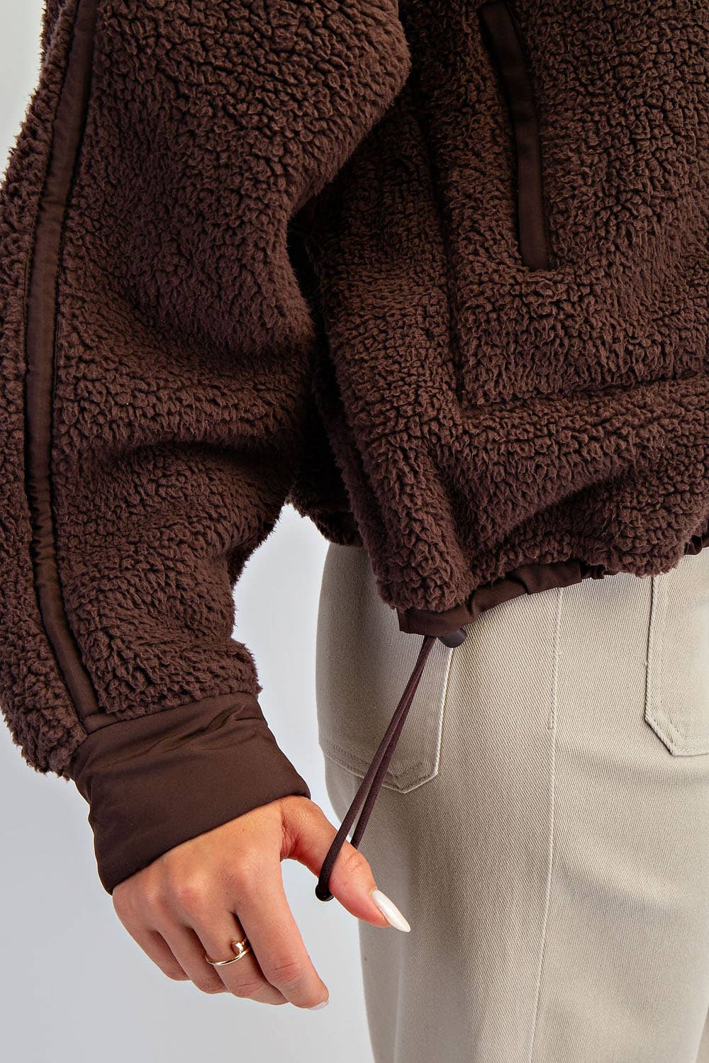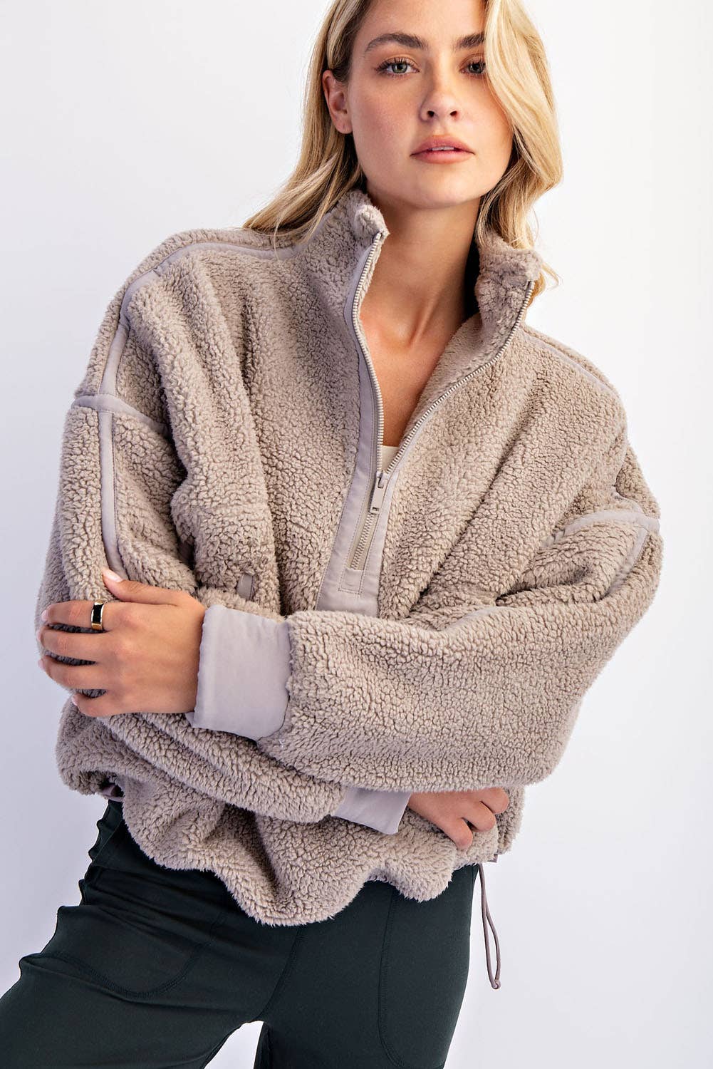 Cozy up in elevated comfort. Crafted from plush sherpa fabric with an airy feel, this quarter-zip pullover offers cloud-like softness without the bulk. Designed with a relaxed fit, dropped shoulders, and a mock neck for a laid-back silhouette, it also features a cinchable hem for adjustable shape and warmth. Side pockets add functionality, making it a go-to essential for chilly days.