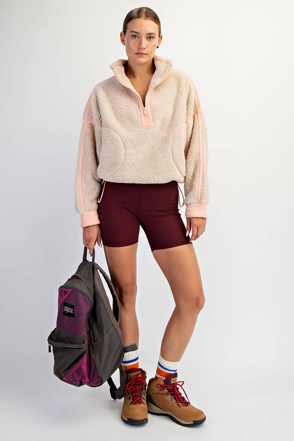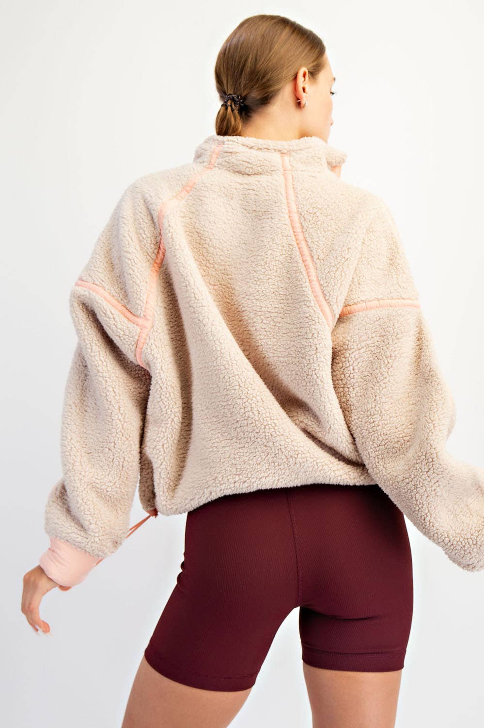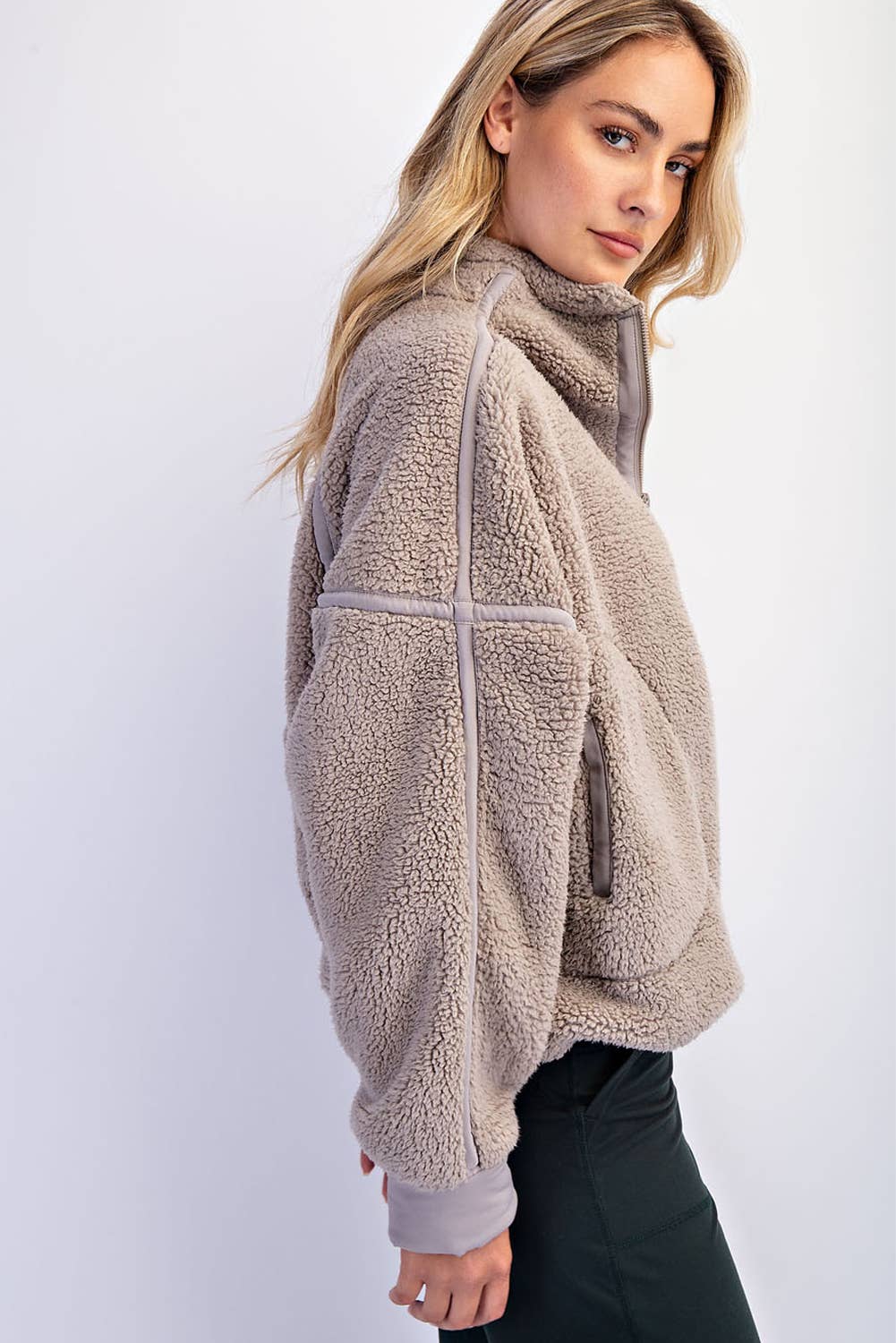 Cozy up in elevated comfort. Crafted from plush sherpa fabric with an airy feel, this quarter-zip pullover offers cloud-like softness without the bulk. Designed with a relaxed fit, dropped shoulders, and a mock neck for a laid-back silhouette, it also features a cinchable hem for adjustable shape and warmth. Side pockets add functionality, making it a go-to essential for chilly days.